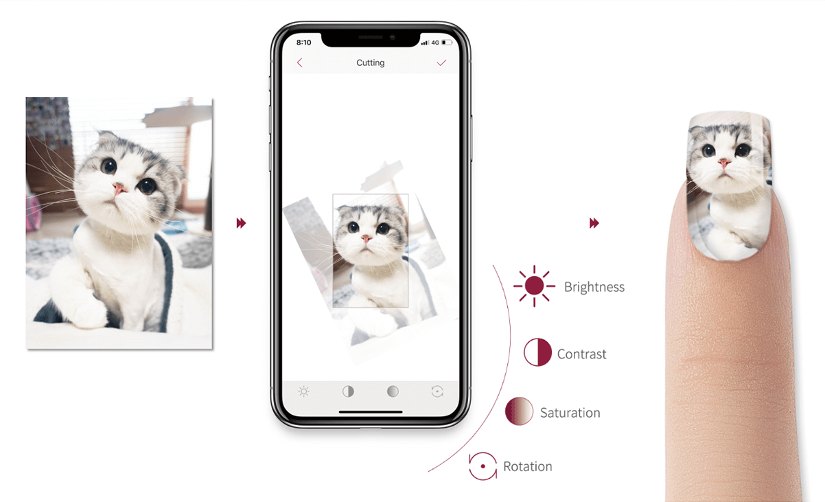 Erkennt automatisch die Form und Größe des Nagels und passt das ausgewählte Muster perfekt an. Gleichzeitig besteht die Möglichkeit, Position und Größe des Designs manuell anzupassen.